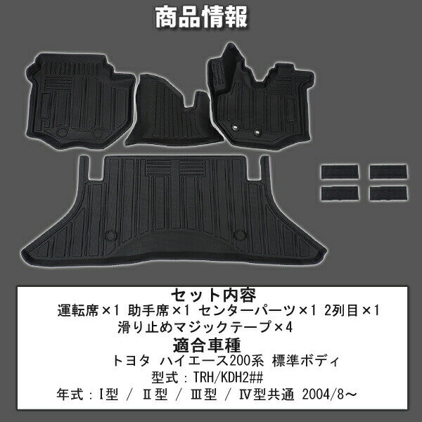 [商品内容] ■セット内容:運転席×1 助手席×1 センターパーツ×1 2列目×1 滑り止めマジックテープ×4 ■カラー:ブラック ■適合車種:トヨタ ハイエース 200系 ■型式:TRH / KDH2## ■年式:I型 / II型 / III型 / IV型共通 2004/8~ ■素材:TPO ※商品表面の凹凸のデザインは変更になる場合が御座いますご了承ください。