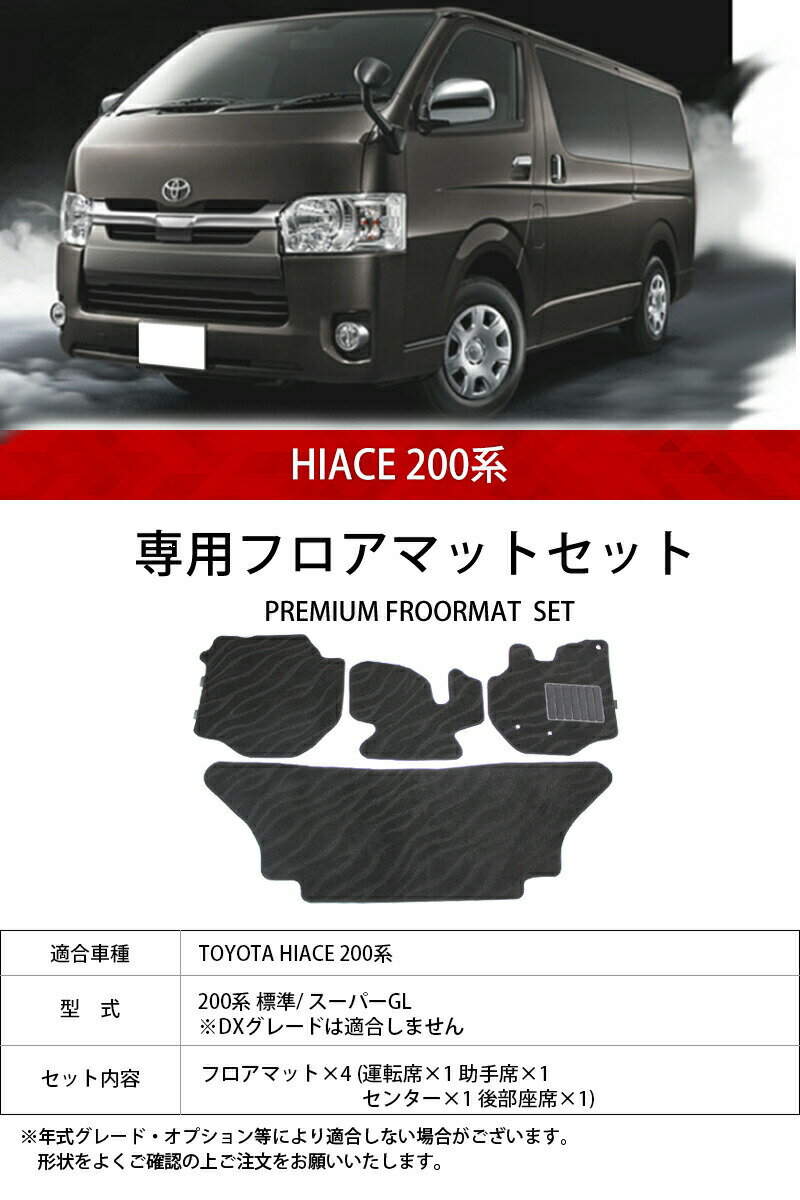 いつまでも清潔な車内空間を [商品内容] ■セット内容:フロアマット×4 (運転席×1 助手席×1 センター×1 後部座席×1)(光触媒コーティング済み) ■カラー:ウェーブブラック ■適合車種:トヨタ ハイエース ■型式:200系 標準 /スーパーGL ※DXグレードは適合しません ■年式:2004年8月〜 ※年式等により適合しない場合が御座います。
