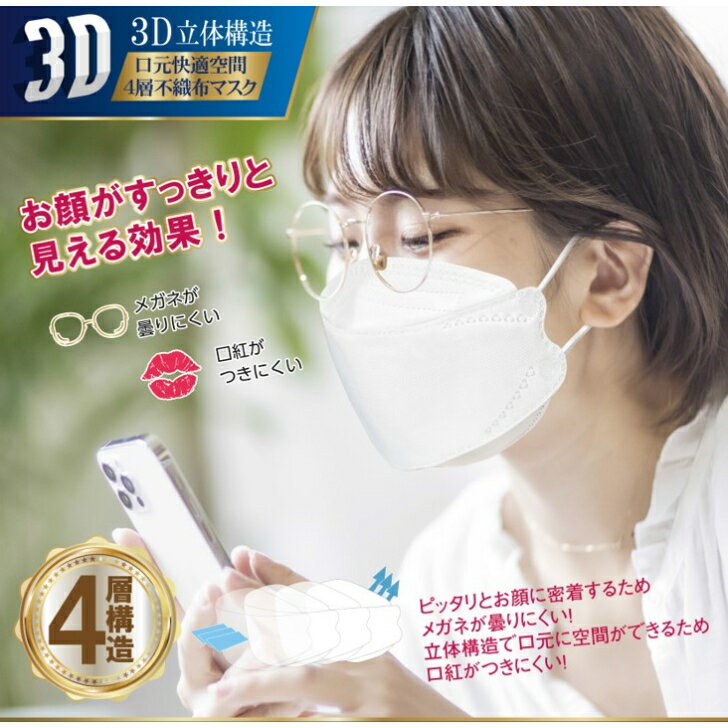 3D 立体 【4層不織布マスク 20枚入り】 メール便パッケージ ふつうサイズ 高機能 不織布マスク ホワイト 不織布 使い捨て冬用マスク 口紅が付きにくい 小顔効果 めがねが曇りにくい 20枚 送料無料