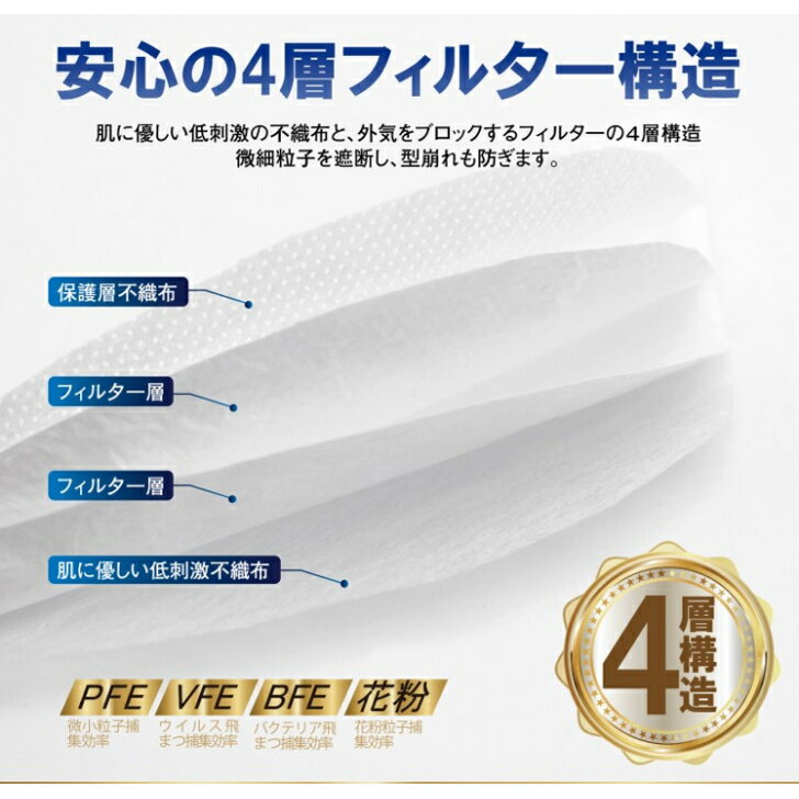 商品情報商品名メール便対応3D立体4層不織布マスク20P 【ホワイト】 マスクサイズ約250×170×30mm素材/成分本体:ポリプロピレン耳ひも部:ポリウレタン ノーズフィット:ポリエチレン+鉄生産地中国製品仕様●容量:20枚入り●対応:男女兼用●サイズ:ふつうサイズ●PFE:微小粒子補集効率●VFE:ウイルス飛まつ補集効率●BFE:バクテリア飛まつ補集効率●花粉:花粉粒子補集効率注意事項※マスクは感染(侵入)を完全に防げるものではありません。