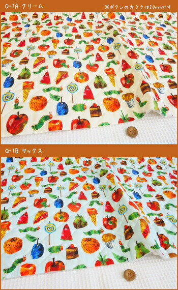 『はらぺこあおむし』とカラフルで美味しそうな たべものいっぱいの可愛い柄の生地です。