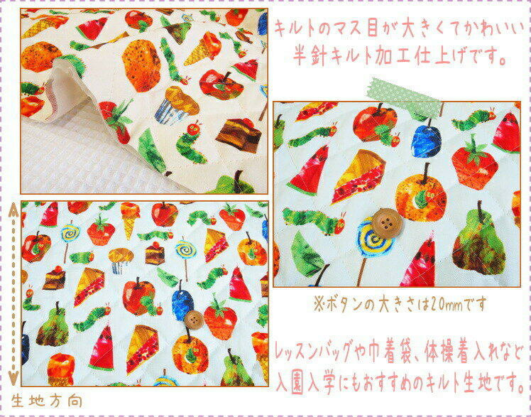 キルティングキャラクター生地≪The Very Hungry Caterpillar≫たべものいっぱい柄大人気『はらぺこあおむし』の半針キルト生地です。☆入園入学におすすめです☆エリック・カールさんの絵本シリーズ