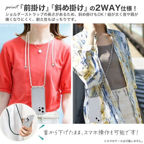 豊富なカラーバリエーションで、どんなスマホにも合わせやすく、クリアケースとの相性も抜群!首や肩からスマホを下げられるので、ポケットやカバンから取り出す手間がなく、旅行などのおでかけや、育児やお仕事で忙しい人にもおすすめです。