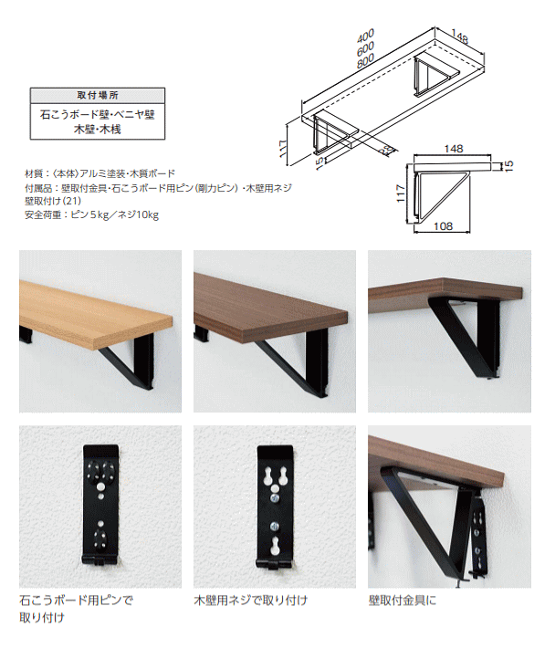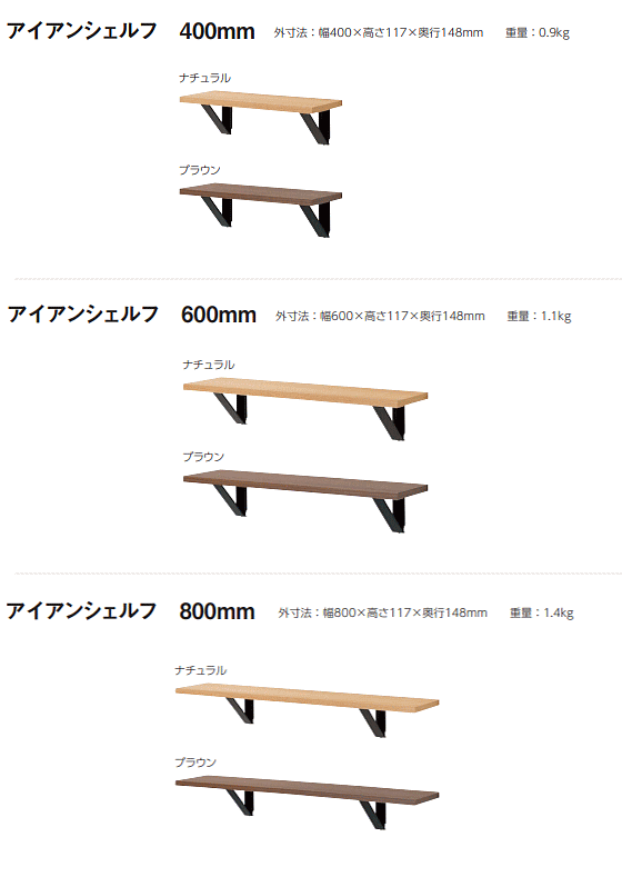アイアン風塗装 シェルフ 400mm・800mm・1200mmの詳細 ■材質 〈本体〉:アルミ塗装・木質ボード ■仕上 ナチュラル・ブラウン ■付属品 壁取付金具・石こうボード用ピン(剛力ピン)・木壁用ネジ ■取付場所 壁取付け(21) ■安全荷重 ピン5kg/ネジ10kg (※安全荷重は均等に乗せた場合で、取り付ける壁面の強度によっても変わります。